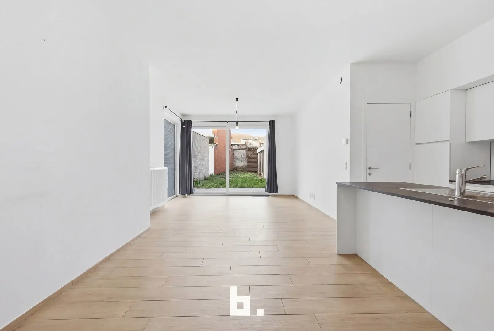 Inkomhal met technische ruimte, gastentoilet, ruime woonkamer, volledig geïnstalleerde open keuken met een aansluitende bergruimte. De eerste slaapkamer beschikt over een aanpalende badkamer met toilet, wastafel en ligbad. De tweede slaapkamer beschikt ook over zijn eigen douchekamer met wastafel. Ruime tuin met zonneterras.