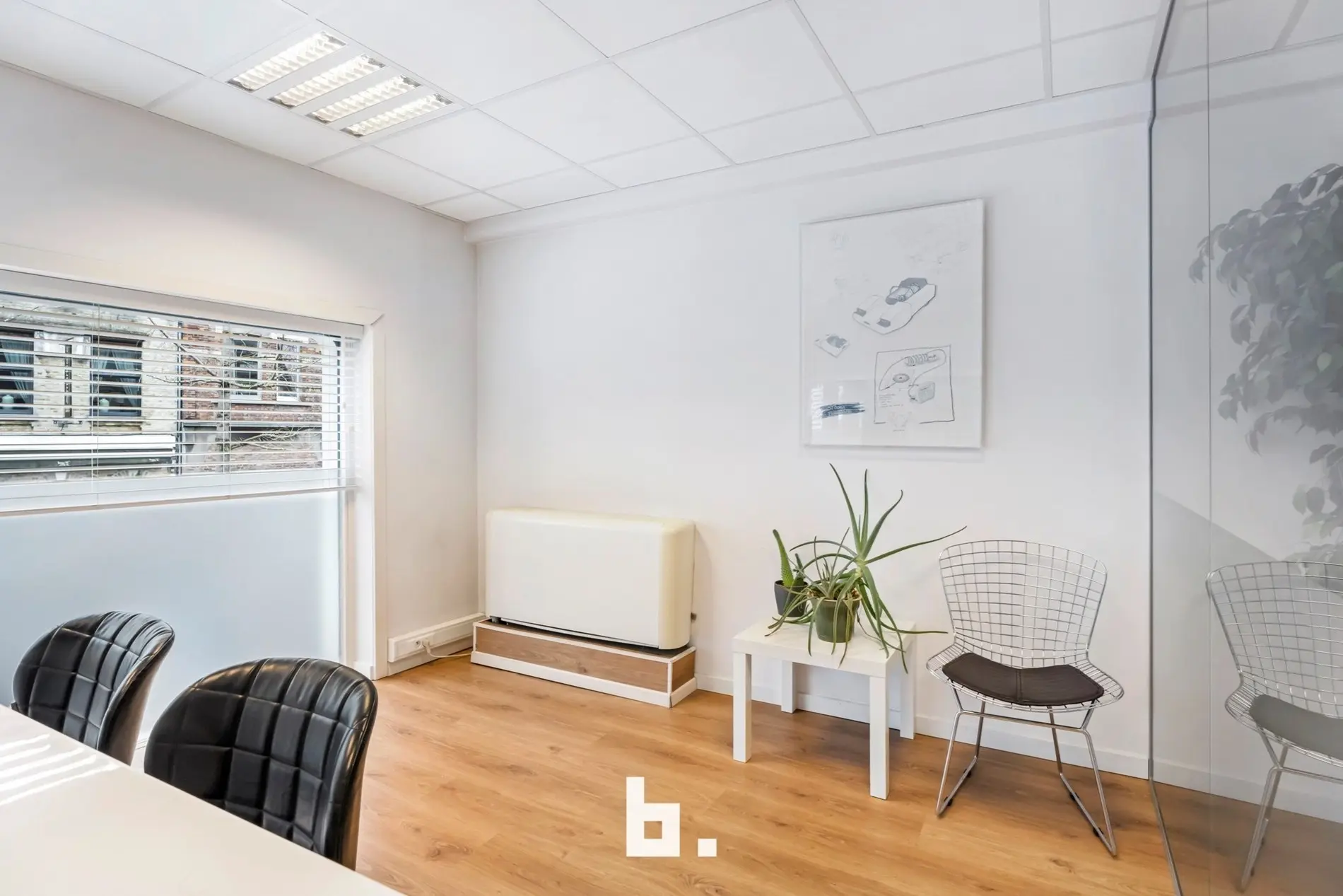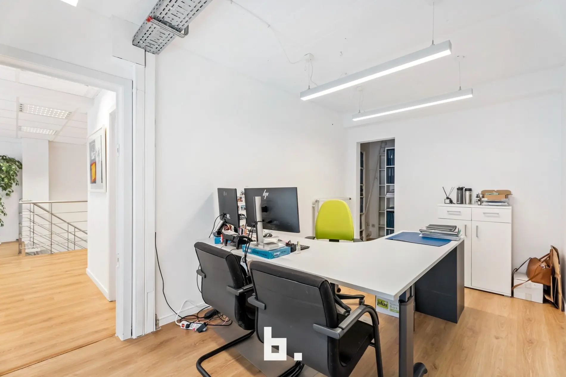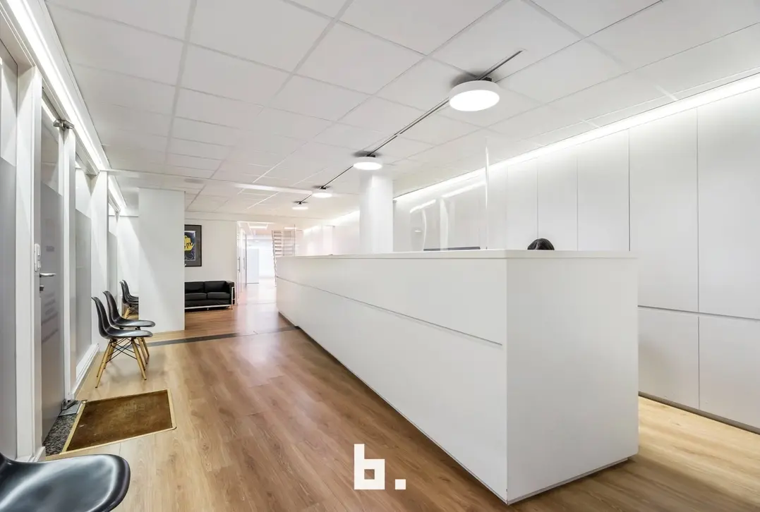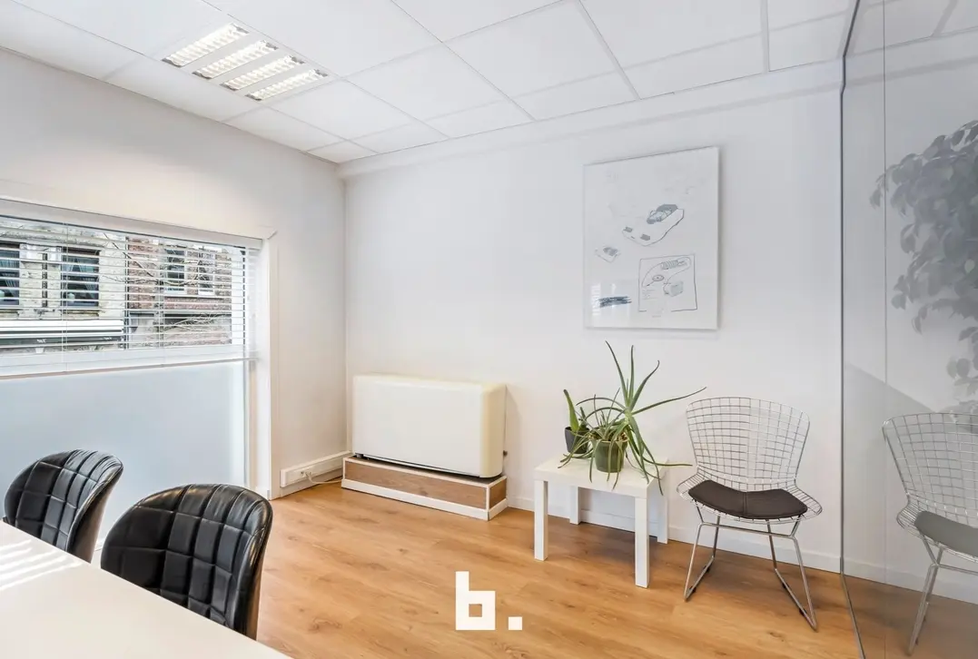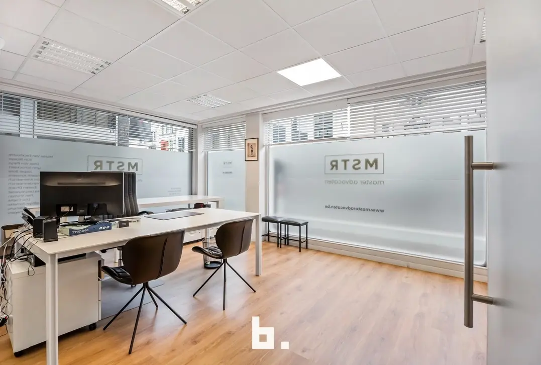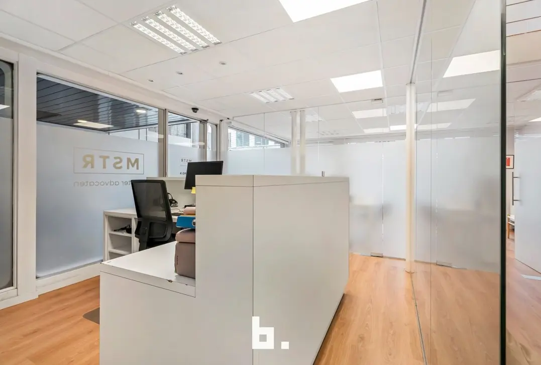 Dankzij de grote raampartijen geniet deze kantoorruimte van een moderne uitstraling en veel lichtinval, wat bijdraagt aan een productieve en aangename werksfeer.