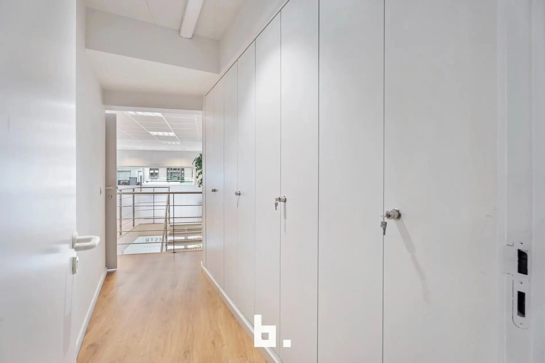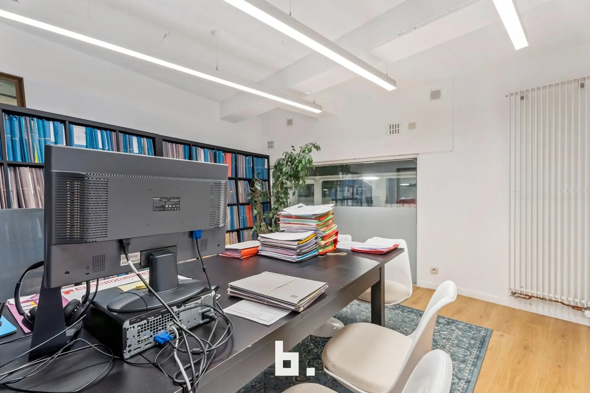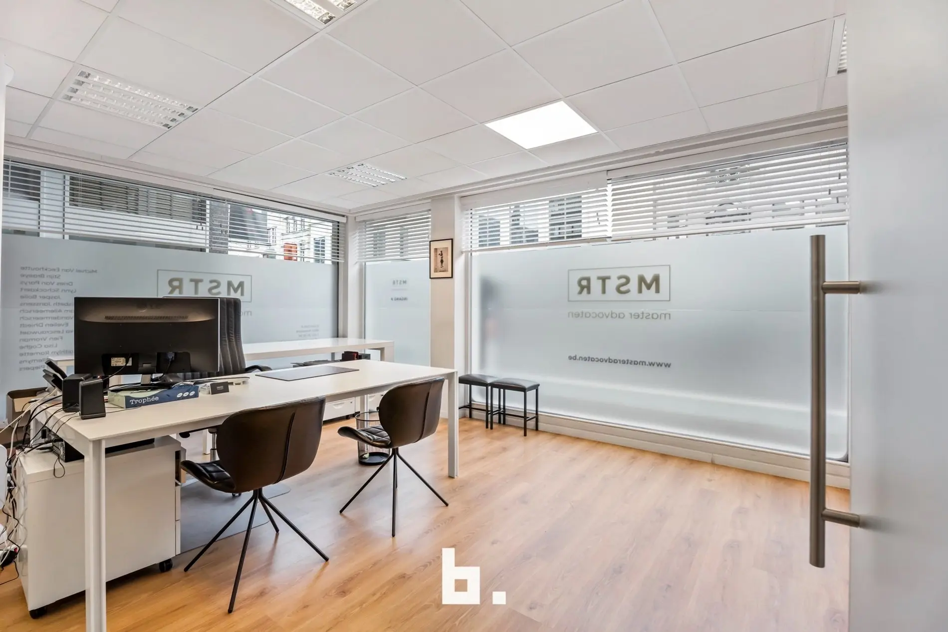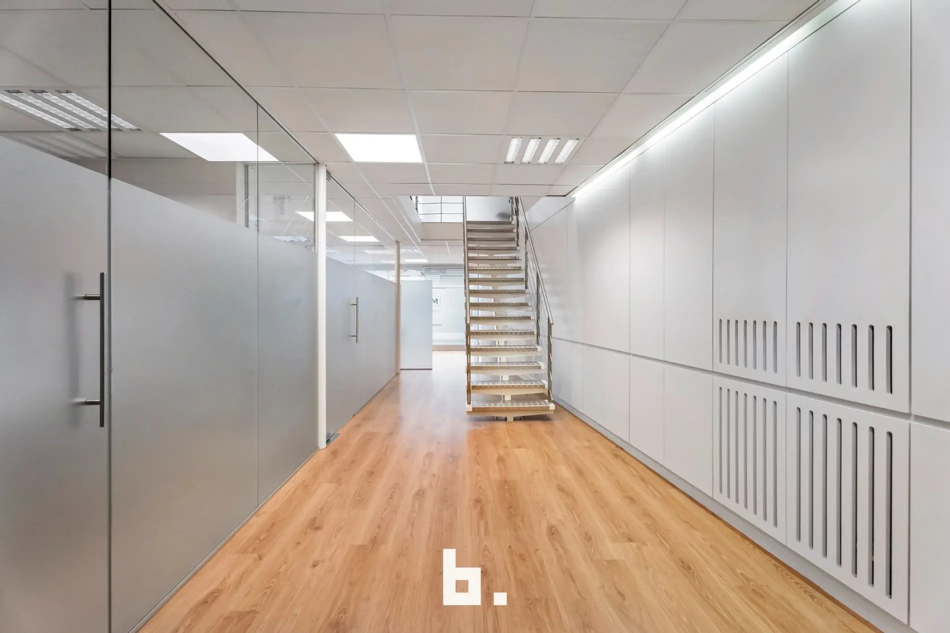 Dankzij de grote raampartijen geniet deze kantoorruimte van een moderne uitstraling en veel lichtinval, wat bijdraagt aan een productieve en aangename werksfeer.
