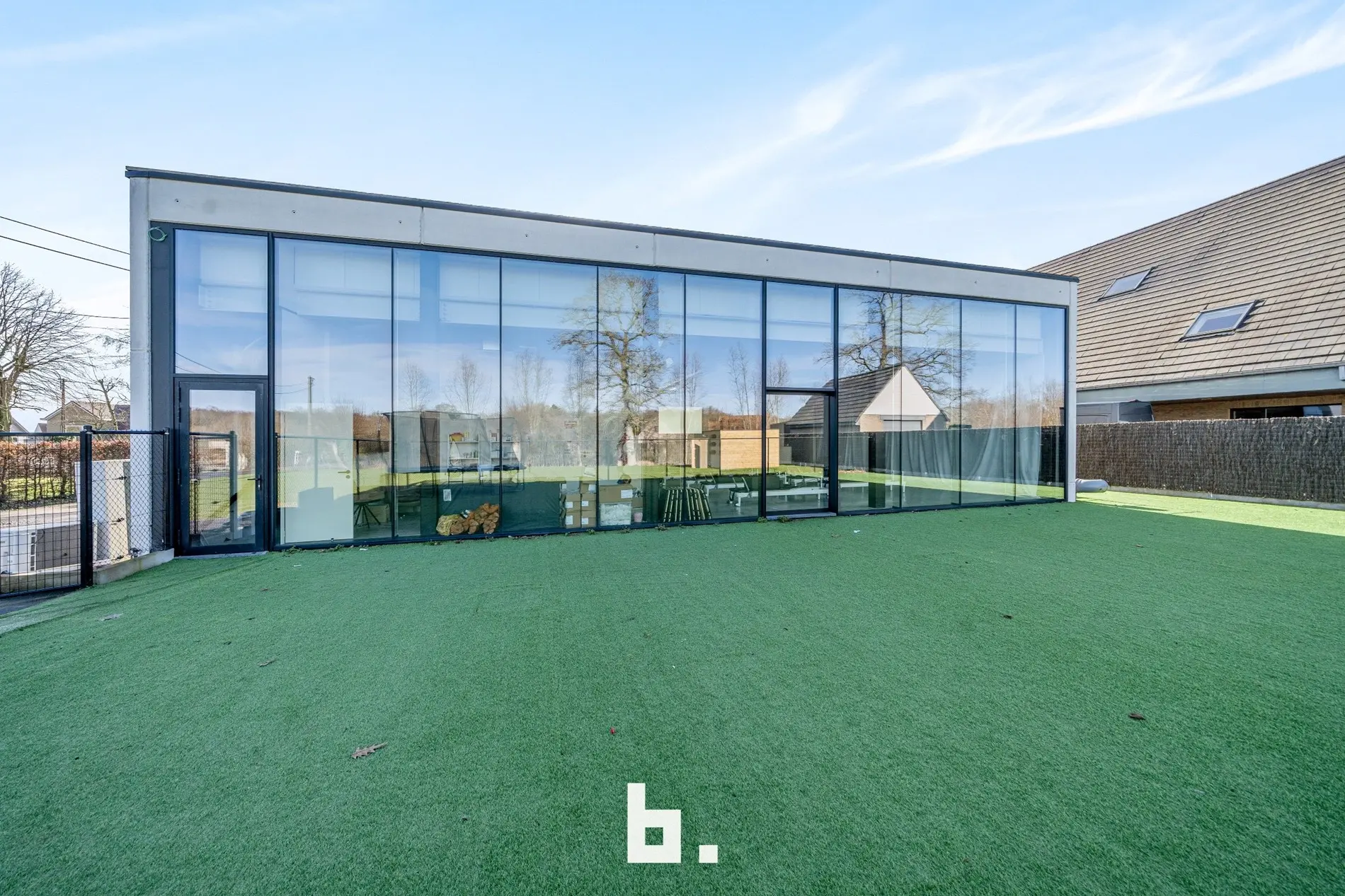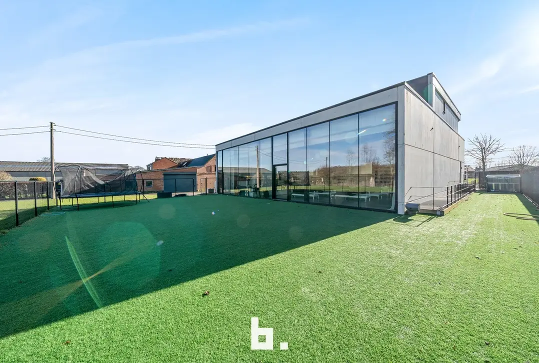 De aparte en ruime handelsruimte (± 110 m²) geniet van veel lichtinval en heeft zicht op en directe toegang tot de tuin, aangelegd met kunstgras en perfect bruikbaar voor diverse activiteiten. In het souterrain bevindt zich bovendien een extra polyvalente ruimte van ± 280 m², ideaal als grote studio, bijkomende sportruimte, kantoren of uitbreiding van de handelsactiviteit.