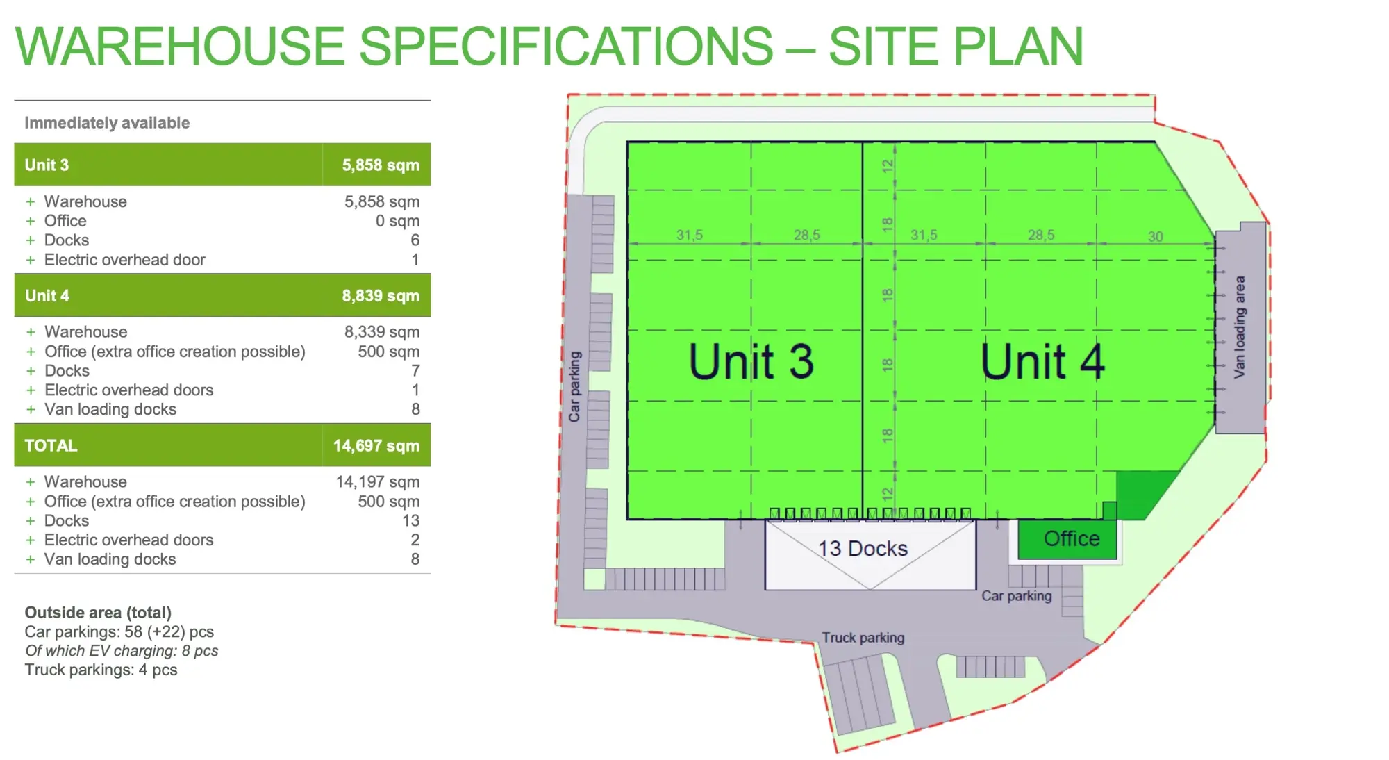 Dit magazijn is beschikbaar vanaf 5.858 m² tot 14.697 m² en heeft volgende specificaties:
