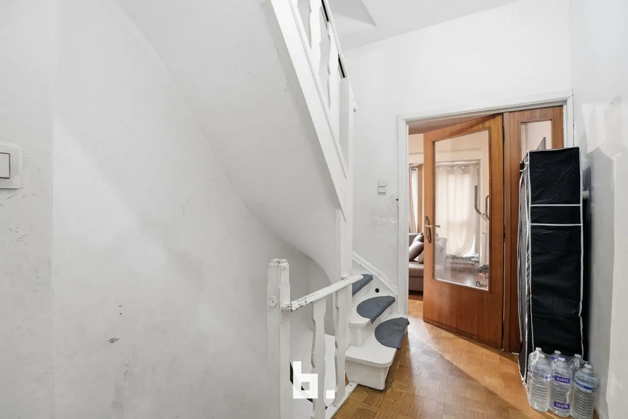 Gelijkvloers: Inkomhal met trap, ruime inpandige garage, praktische berging, kelder en koer met uitweg via dienstdoorgang.