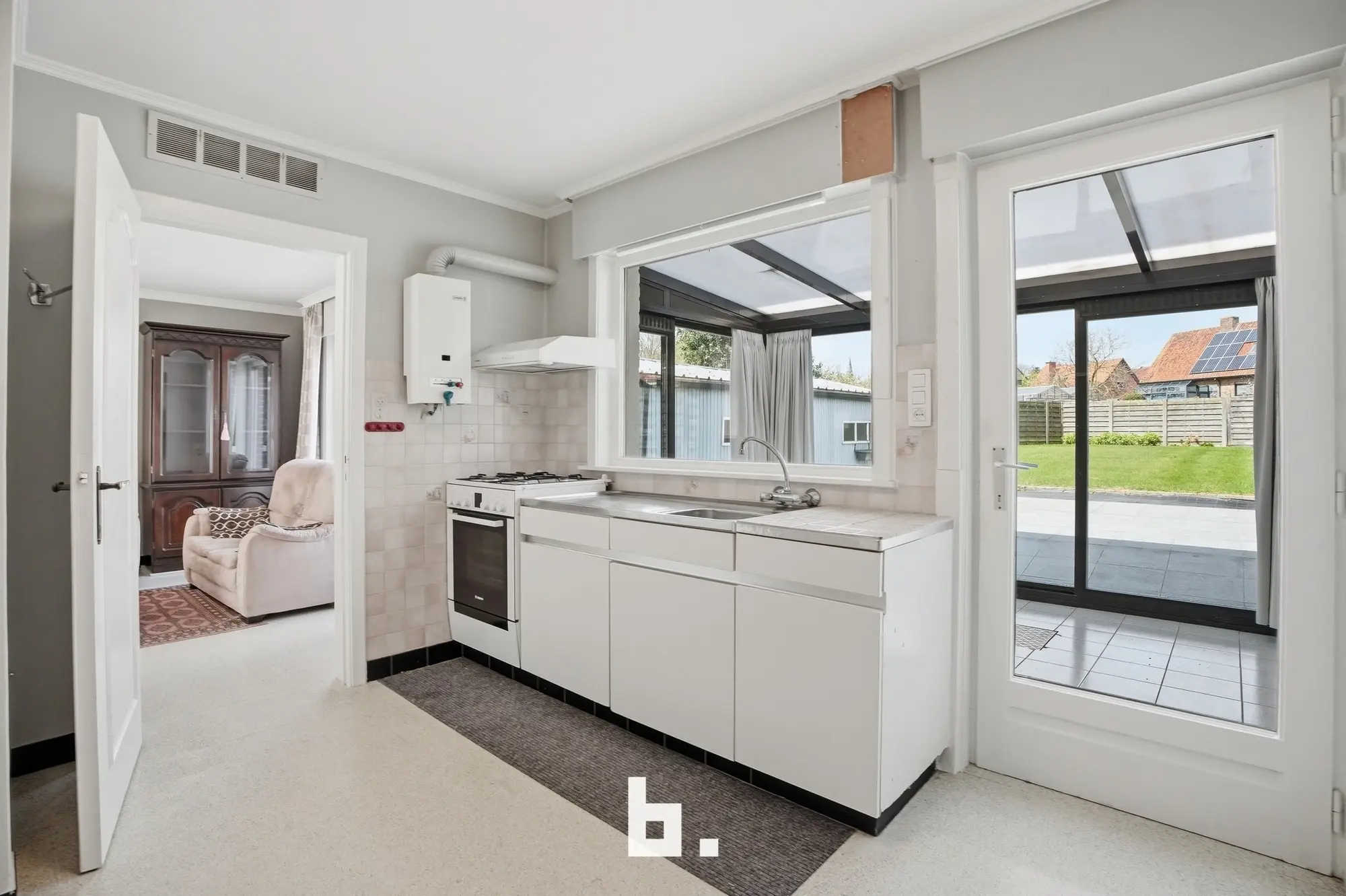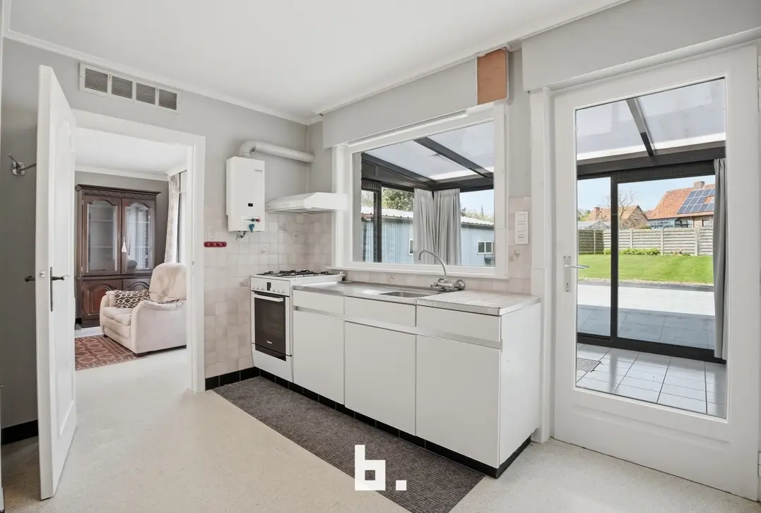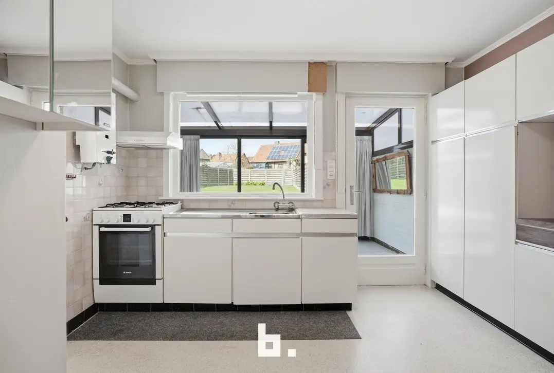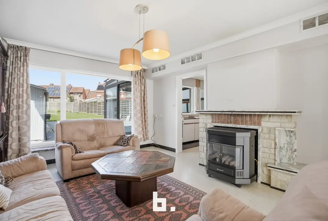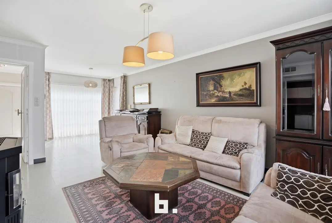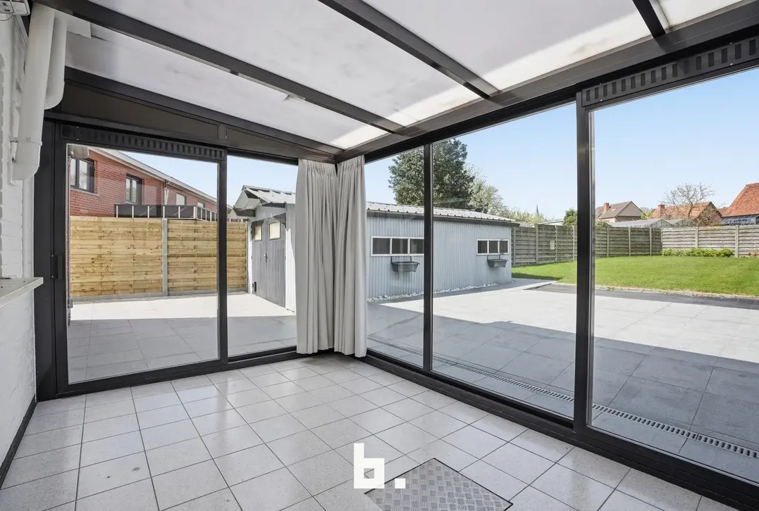 Bij het betreden van de woning wordt u verwelkomd in een lichtrijke woonkamer die in verbinding staat met de keuken. De grote raampartijen zorgen voor een aangename lichtinval en een open gevoel. Aansluitend werd een veranda voorzien, ideaal om het hele jaar door te genieten van het zicht op de tuin.