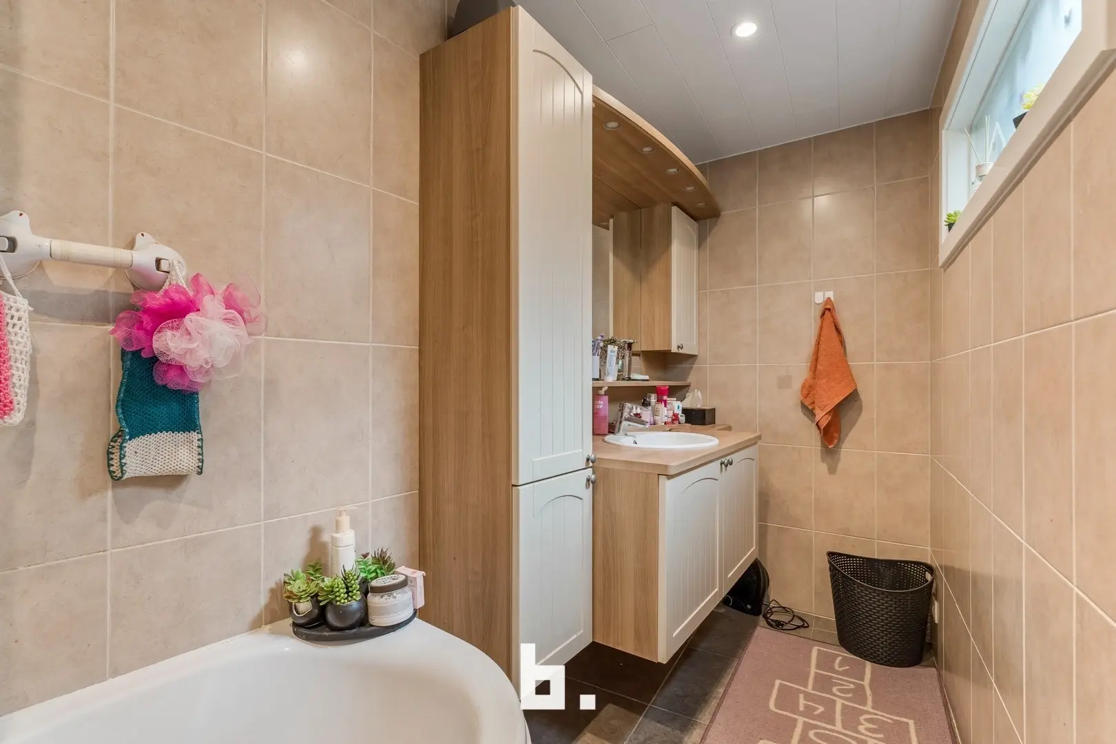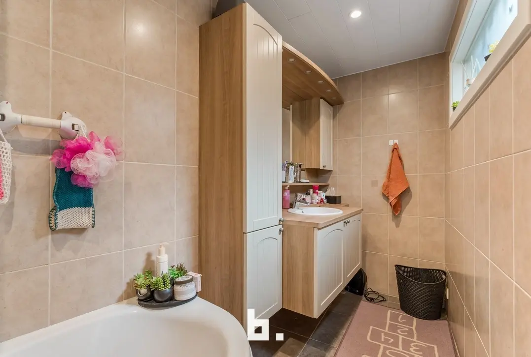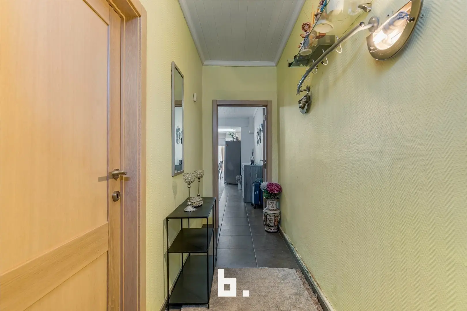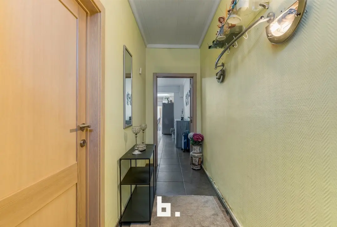 Inkomhal, leef- en eetplaats, open keuken met eethoek, badkamer met ligbad en lavabomeubel, afzonderlijk toilet en een veranda met zicht op de leuke stadstuin.