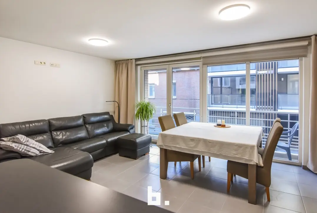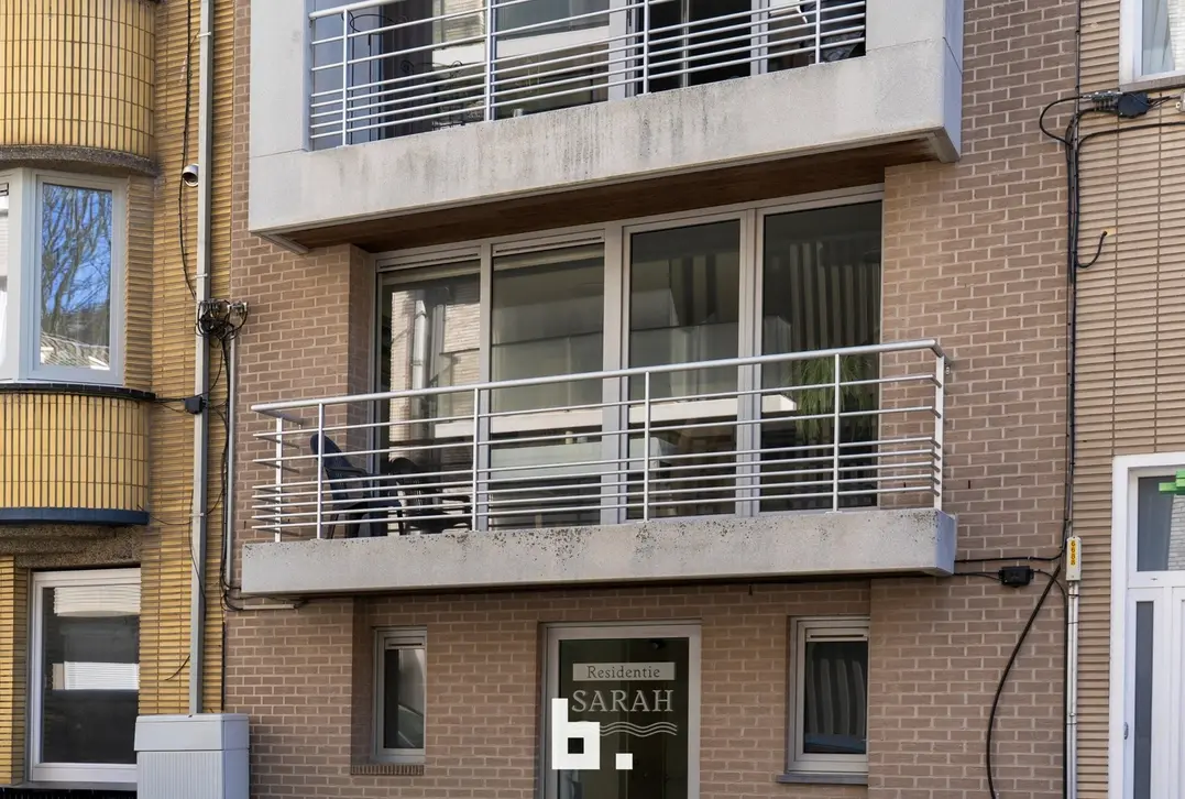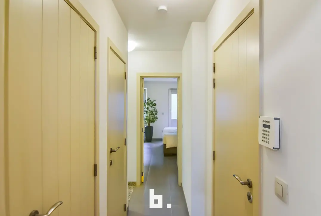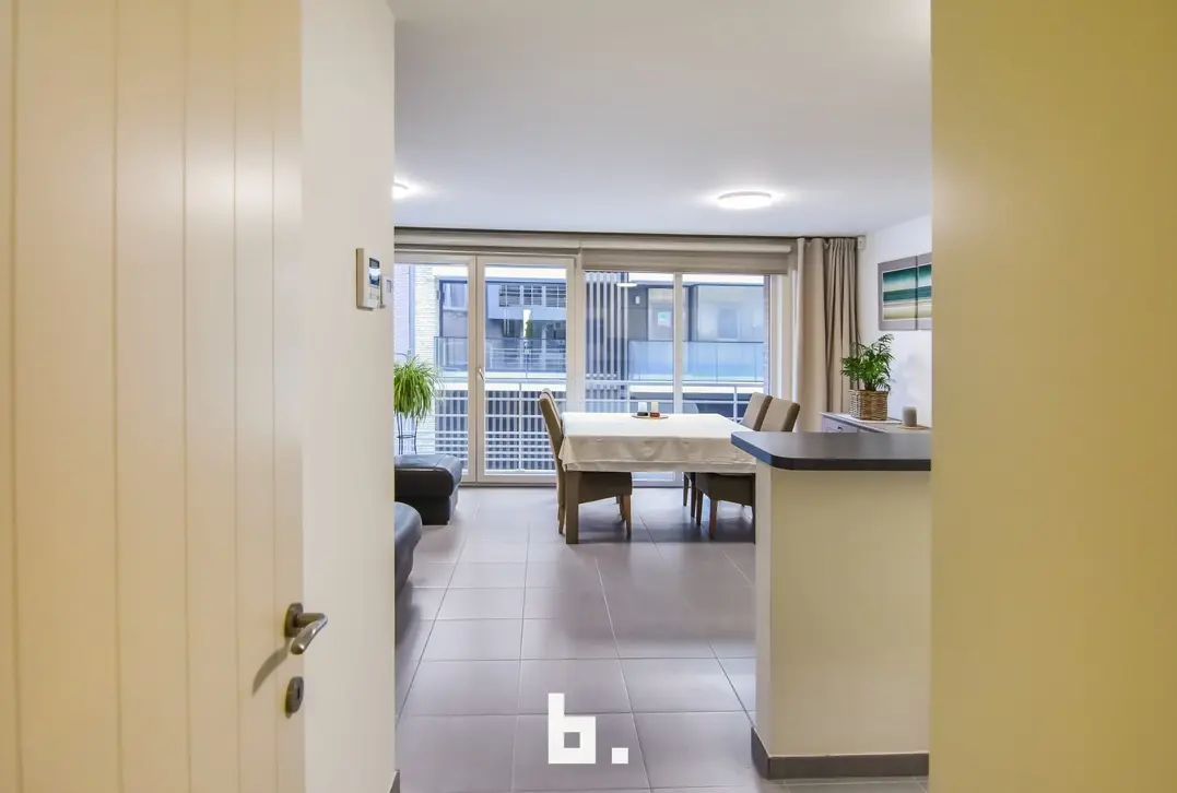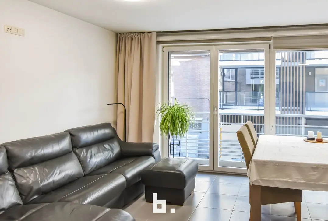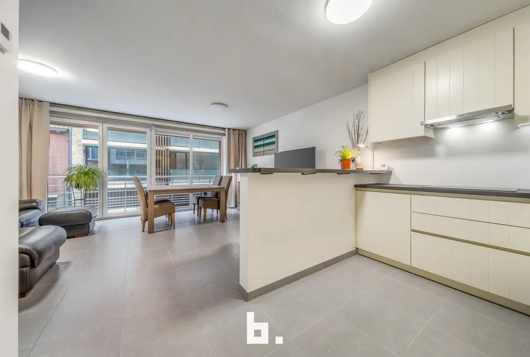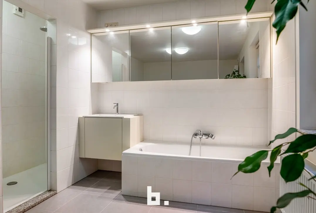 Op de eerste verdieping bevindt zich een mooi en lichtrijk appartement met een ruime living en open keuken. Aan de straatzijde is er een klein terras. Verder beschikt deze verdieping over een aparte berging, een apart toilet en een slaapkamer met aansluitend een open badkamer, uitgerust met een bad en inloopdouche. Achteraan is er bovendien een nog in te richten binnenterras.