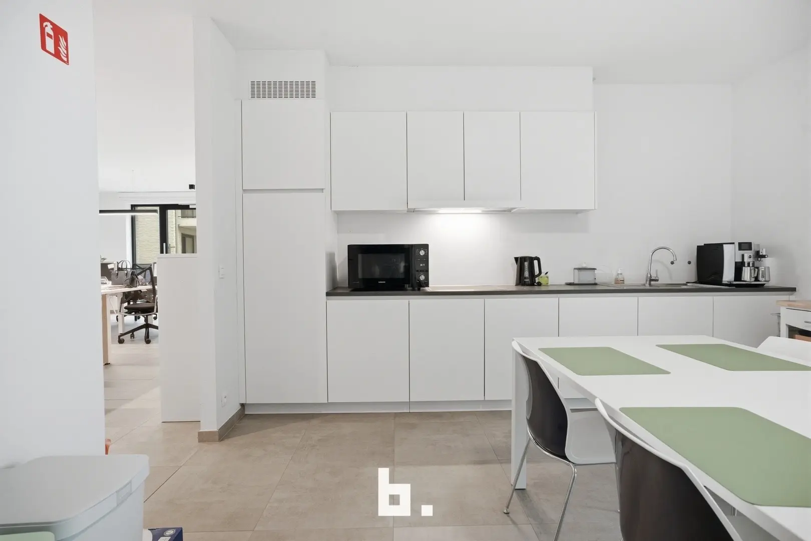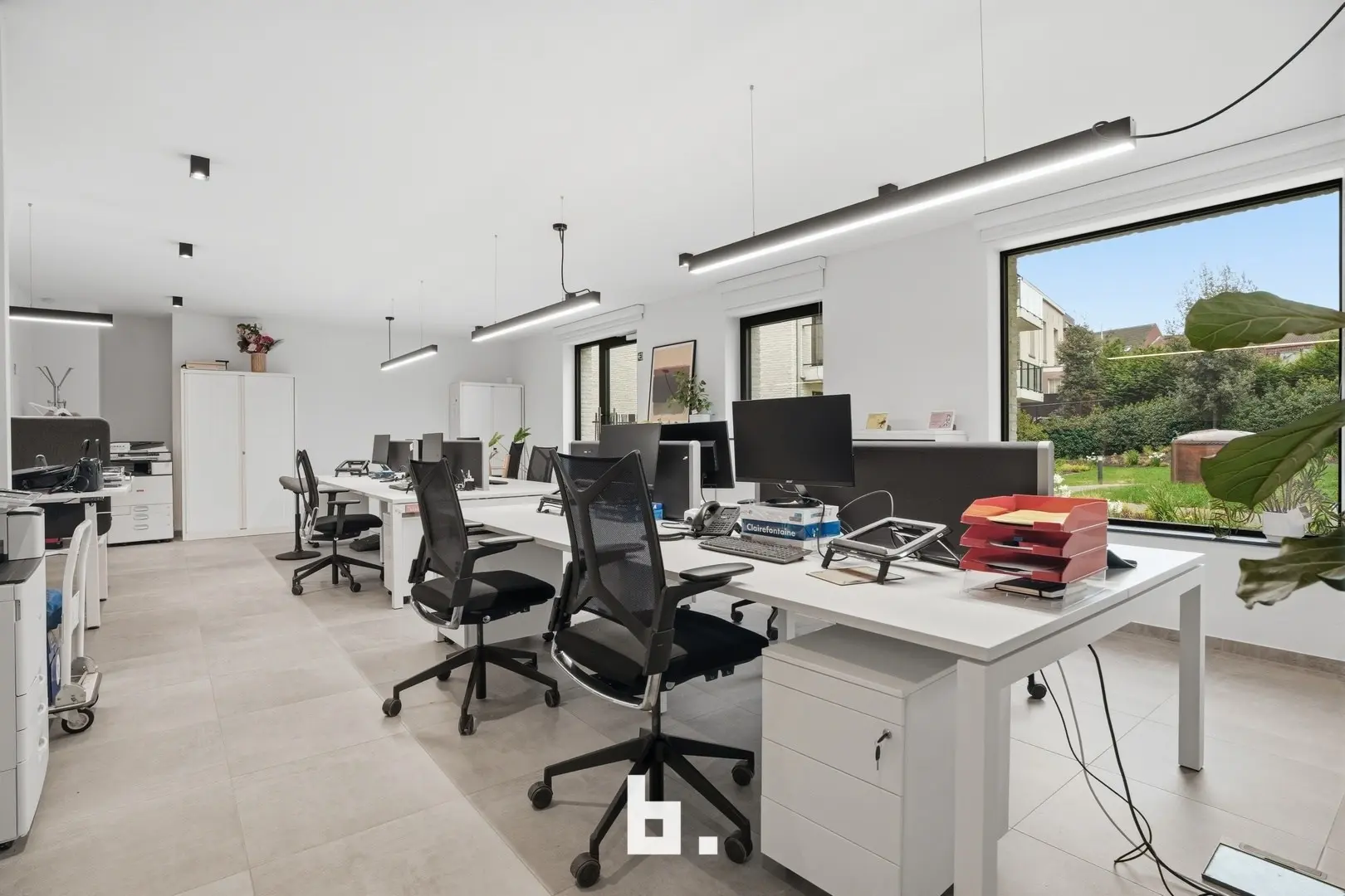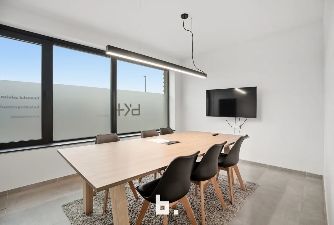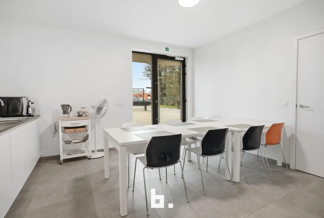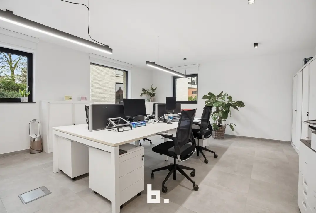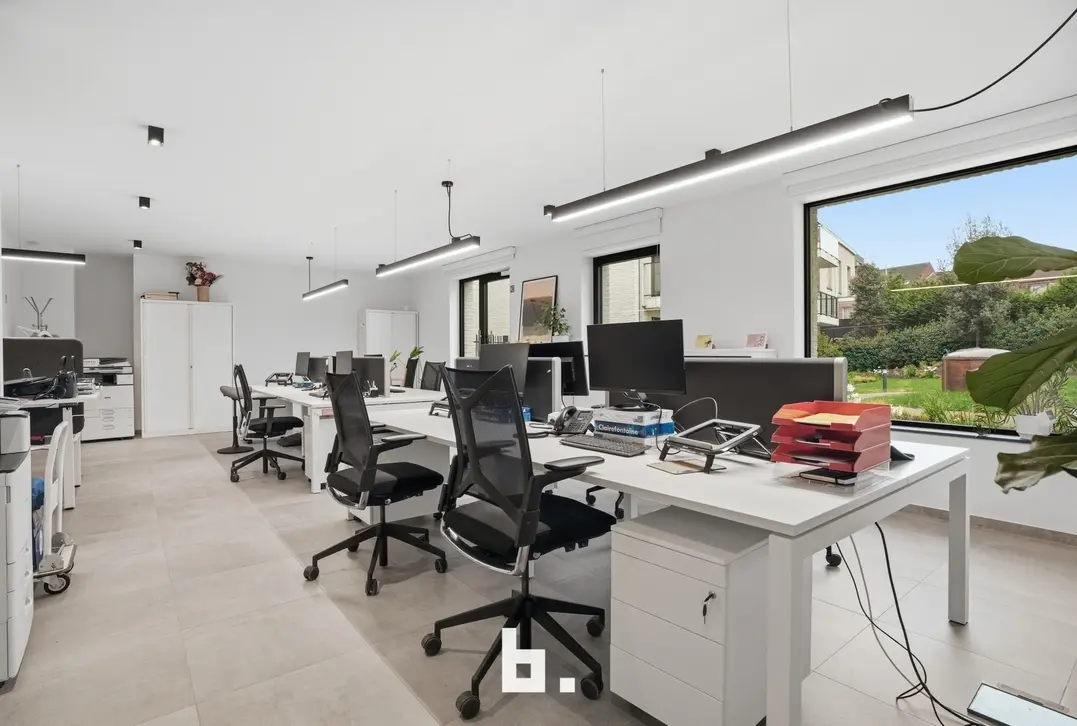 De ruimte omvat een open landschapskantoor, aangevuld met twee afzonderlijke kantoren of vergaderruimtes, een volledig uitgeruste keuken, praktische bergruimte en sanitaire voorzieningen met douche. Aansluitend vindt u een terras in een groene omgeving, wat zorgt voor een extra troef en een aangename pauzeplek.