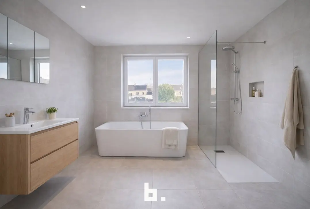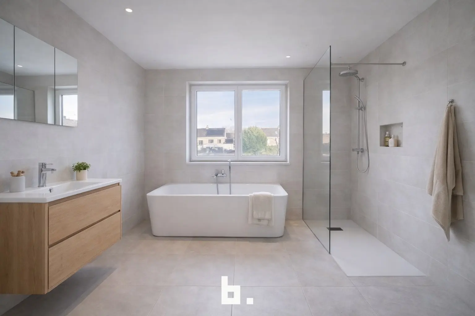 Eerste verdieping: 1 slaapkamer, badkamer met ligbad, inloopdouche, dubbele wastafel