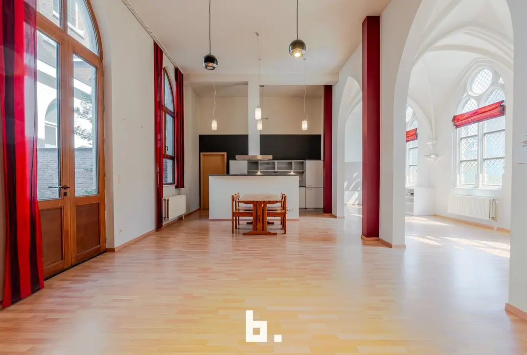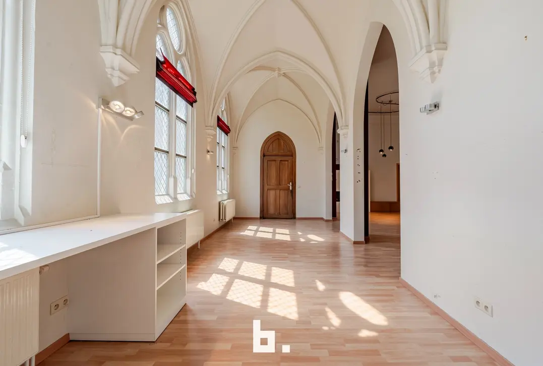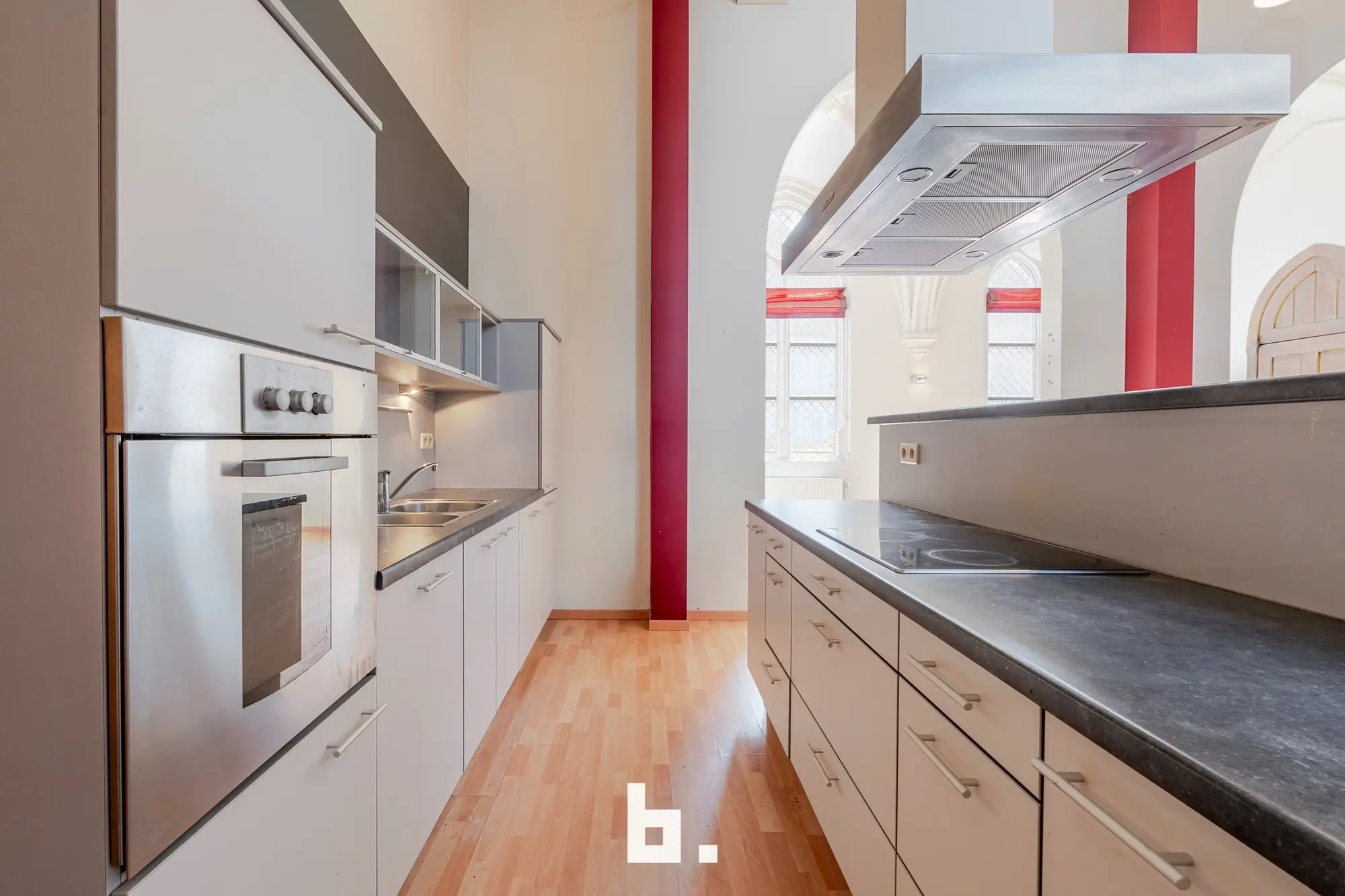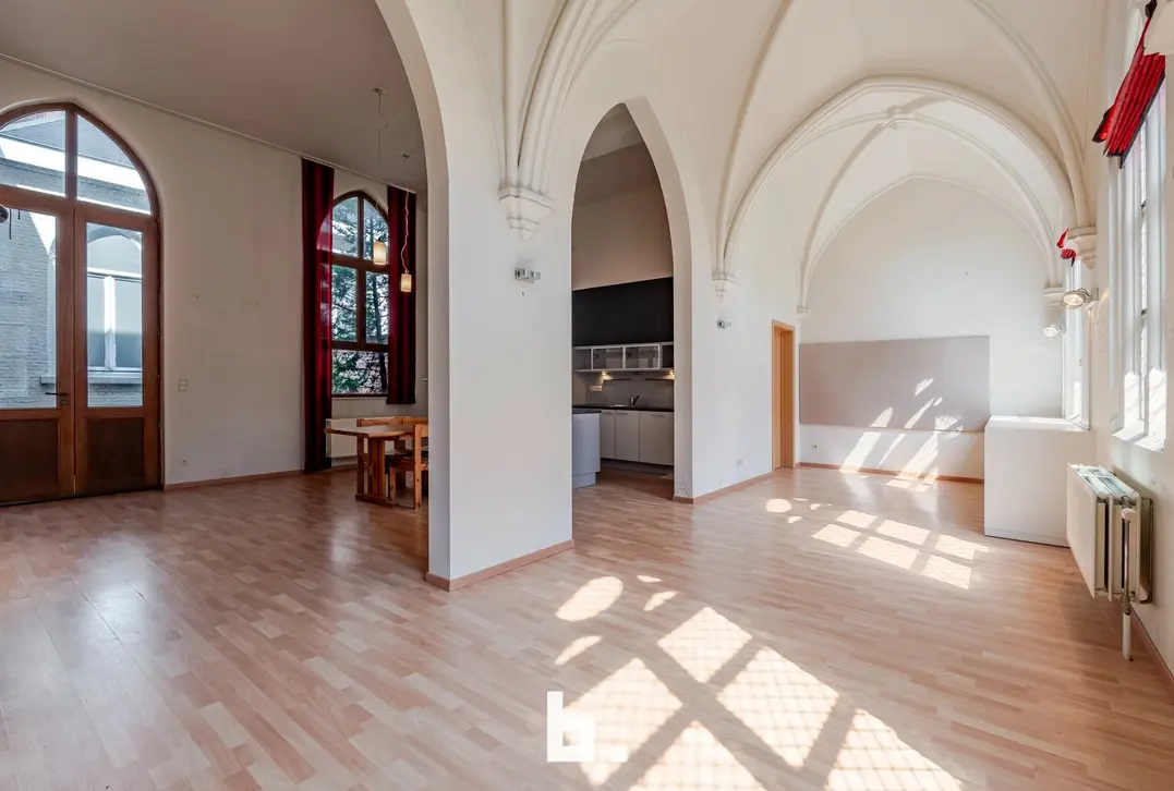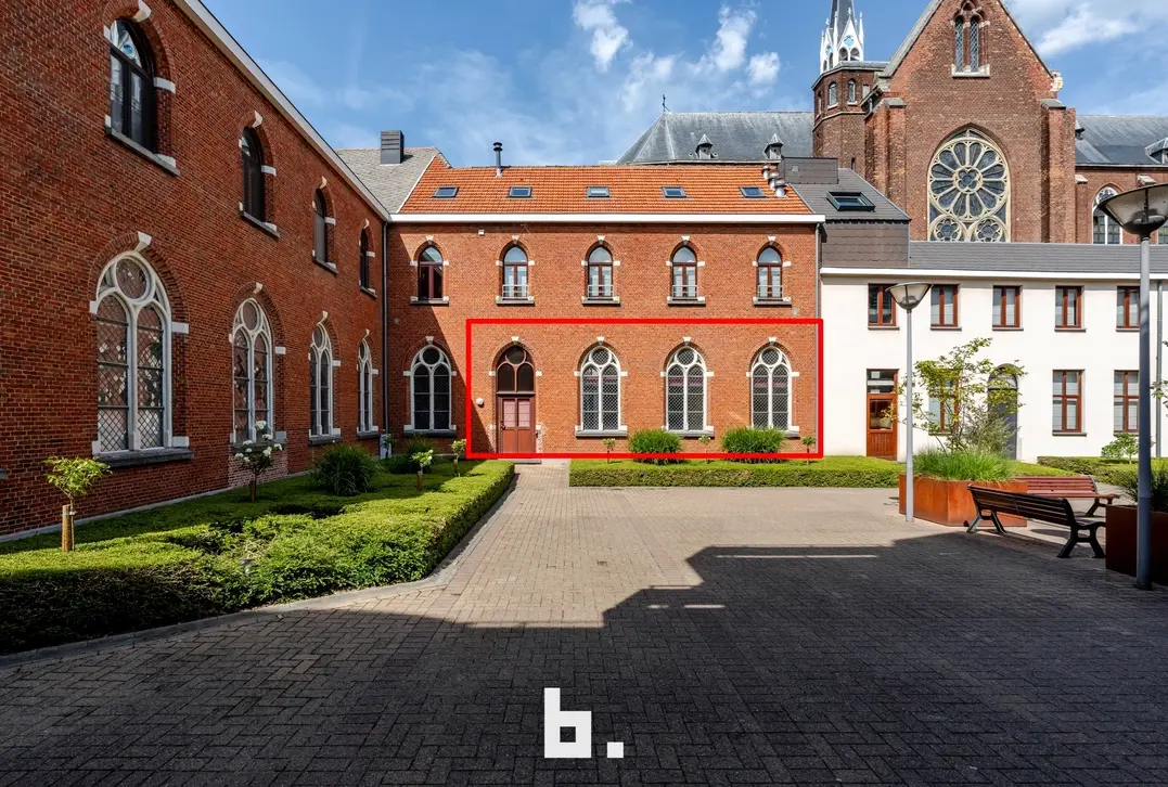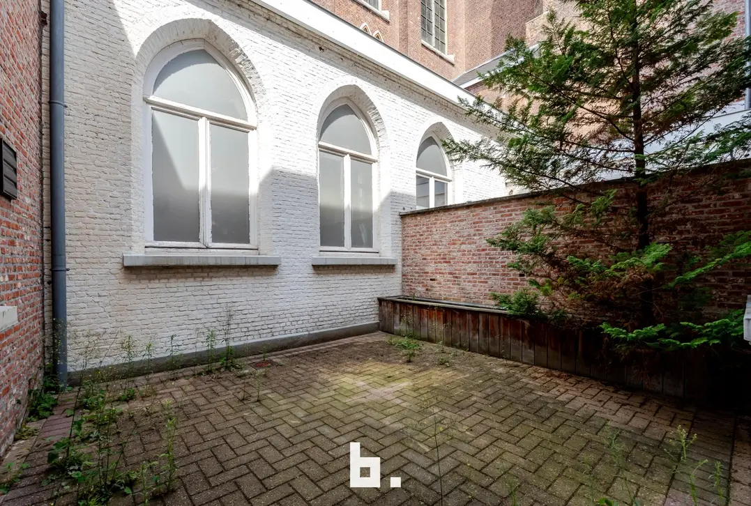 Deze uitzonderlijke woning bevindt zich in de neogotische kloostervleugel van site 'Patershof', die is omgetoverd naar een voortreffelijke residentie. Een enorm ruimtegevoel werd gecreëerd door o.a. grote raampartijen en goede vormgeving waarbij het behoud van authentieke elementen centraal staan. Via het gezellige groene binnenplein kan u de woning bereiken. Bij het betreden van het pand krijg je een instant wauw-gevoel door de hoge plafonds, de authentieke booggewelven en glasramen die verwerkt zijn in de woonruimte. De leef- en eetruimte vormen samen met de open keuken een mooi geheel waardoor je een leuke interactie ervaart tussen de ruimtes. De keuken is volledig uitgerust met kasten, toestellen en extra bergruimten (voorraadberging). Via de leefruimte kan u via het dubbel deurraam het terras betreden.