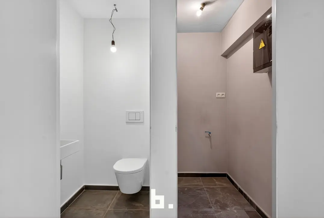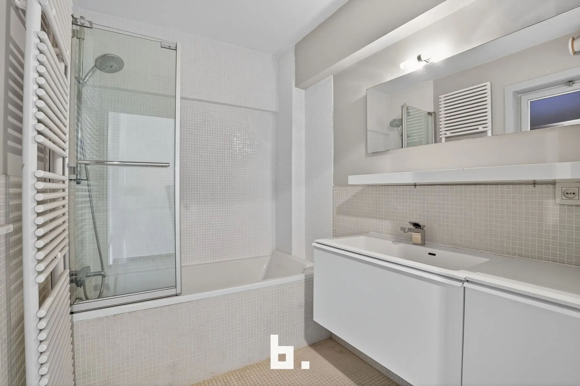 Links van de inkom kom je in de lichtrijke leefruimte, volledig omgeven door glas langs de voorzijde. De schuiframen brengen je naar een zonnig balkon met zicht op de bruisende winkelstraat. De open, volledig vernieuwde keuken sluit naadloos aan bij de woonkamer en vormt het hart van dit appartement.