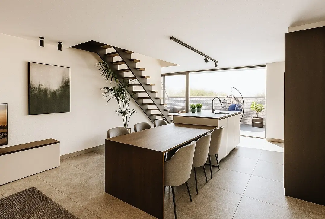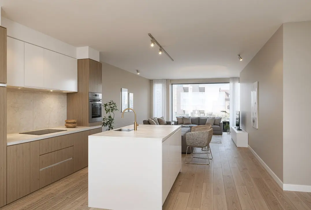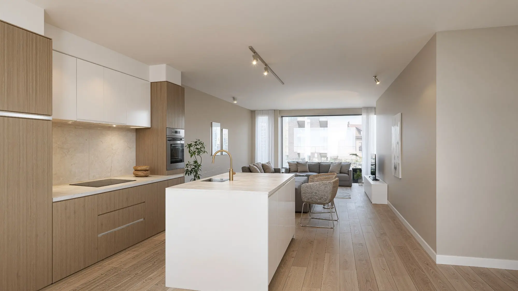 De keukens zijn modern en functioneel ingericht met kwalitatieve toestellen zoals een inductiekookplaat, een energiezuinige koelkast, vaatwasmachine en combi-oven. Badkamers zijn stijlvol afgewerkt met hedendaagse materialen en moderne sanitaire toestellen die rust en comfort uitstralen. Ook in de slaapkamers staat woonkwaliteit centraal: ze zijn rustig gelegen en afgewerkt met warme materialen zodat ze een oase van ontspanning vormen.