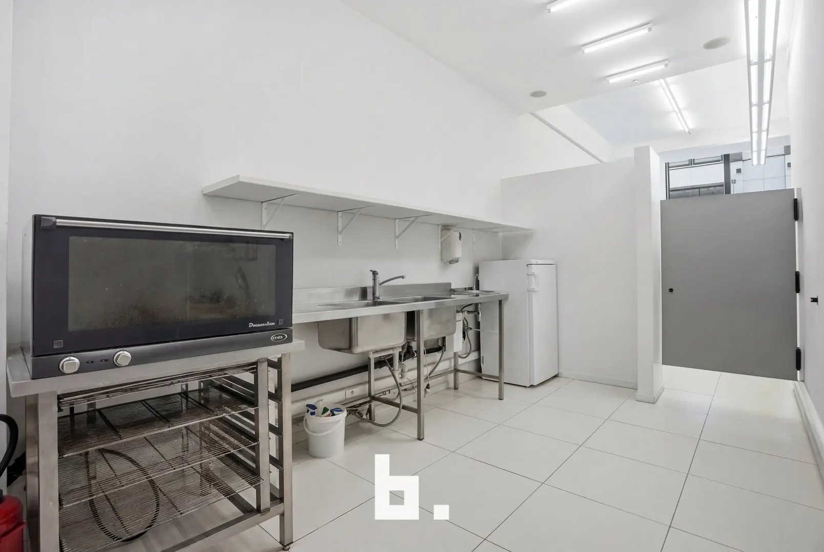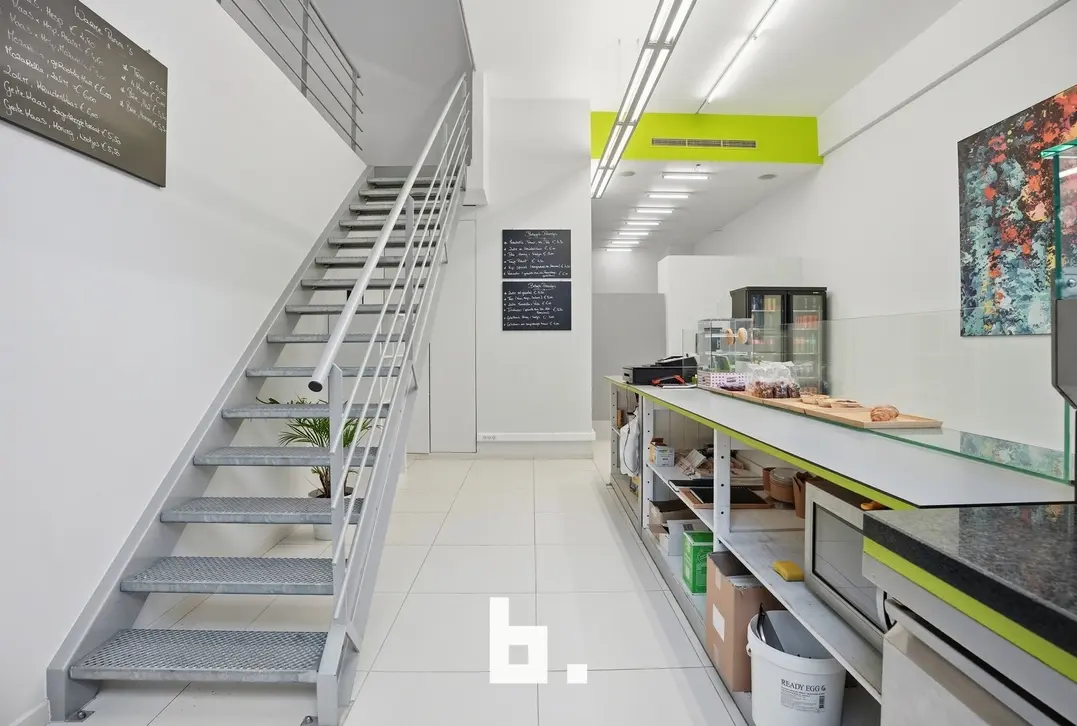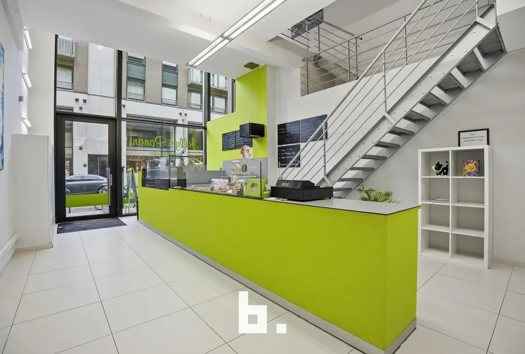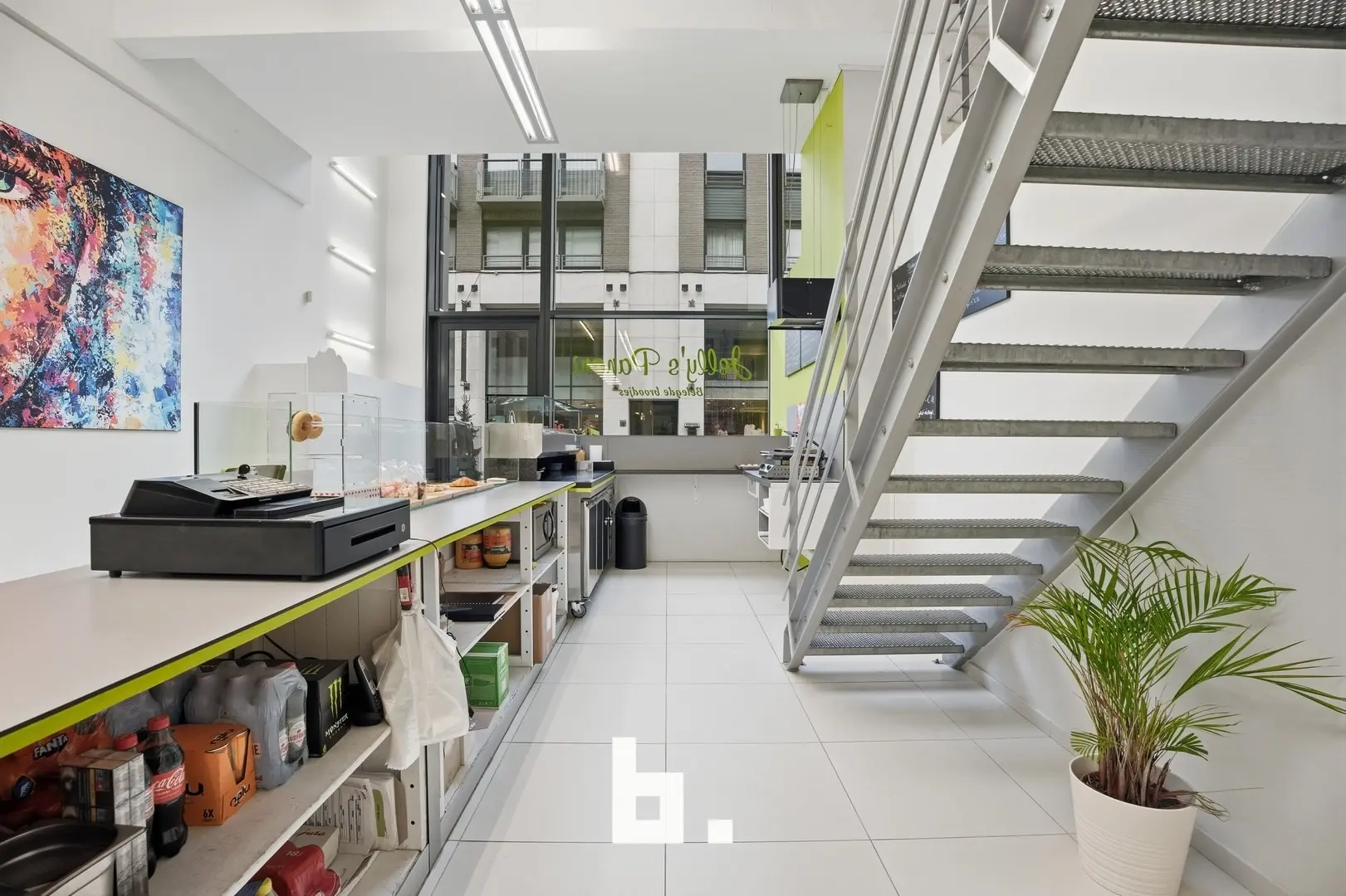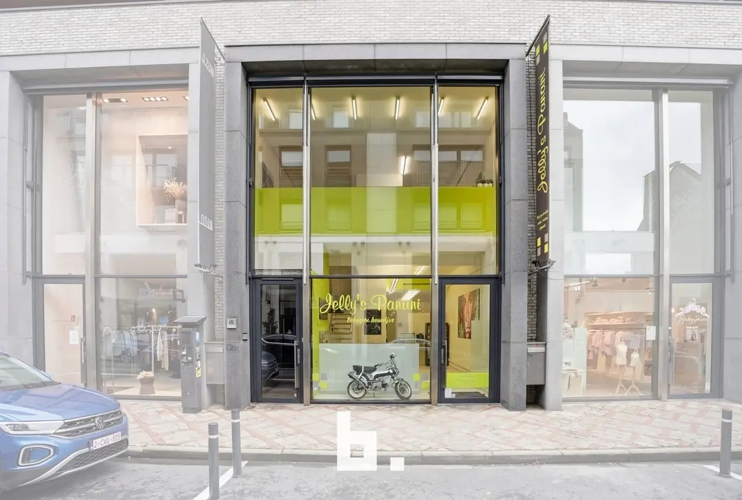 De gelijkvloerse handelsruimte van 97 m² is strak en hedendaags afgewerkt en leent zich perfect voor uiteenlopende commerciële activiteiten zoals kleinhandel, retail, kantoor of dienstverlening. Op de eerste verdieping bevindt zich bijkomend 67 m² aan ruimte, ideaal als privéruimte, stockruimte of ondersteunende functie en een ruim terras.