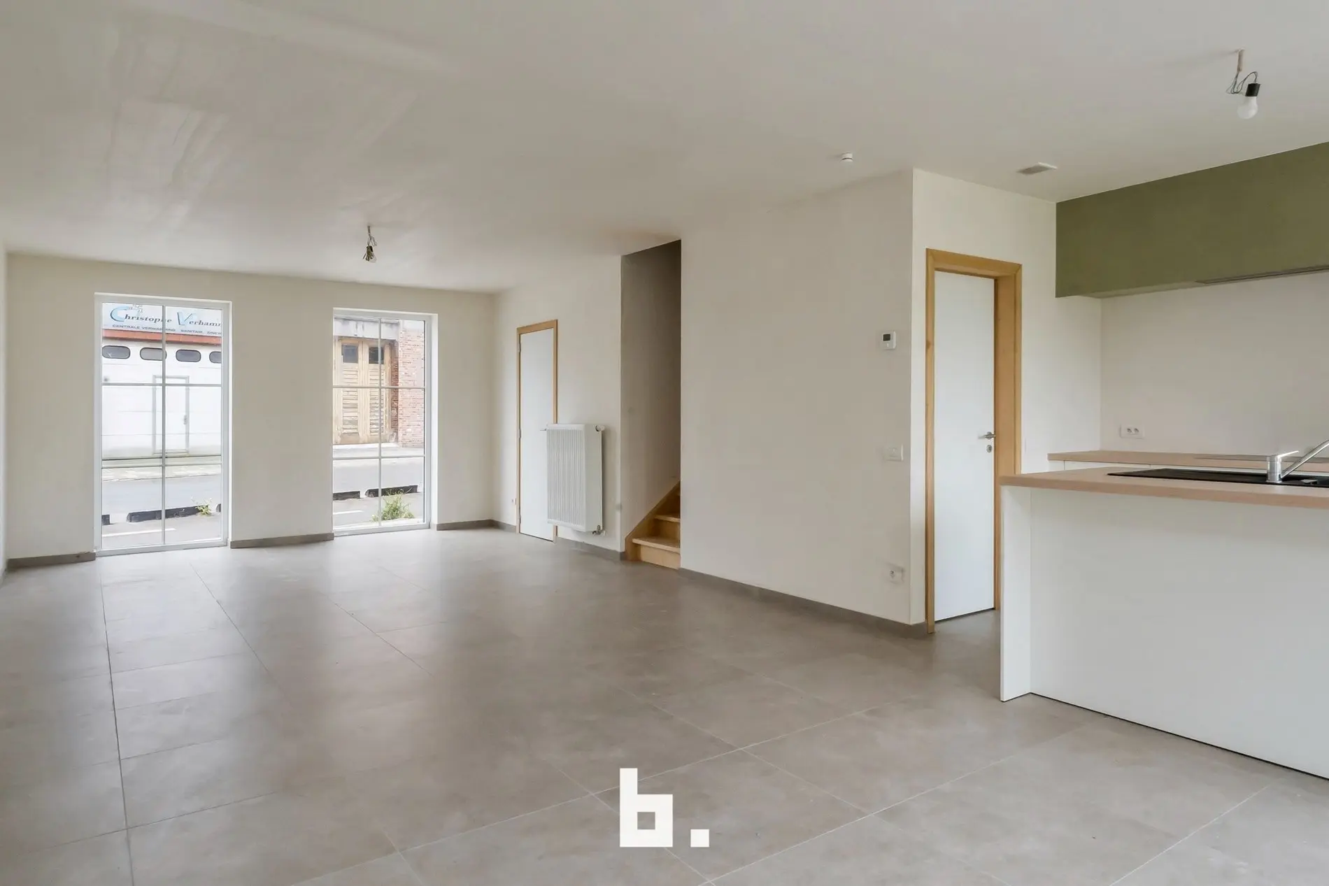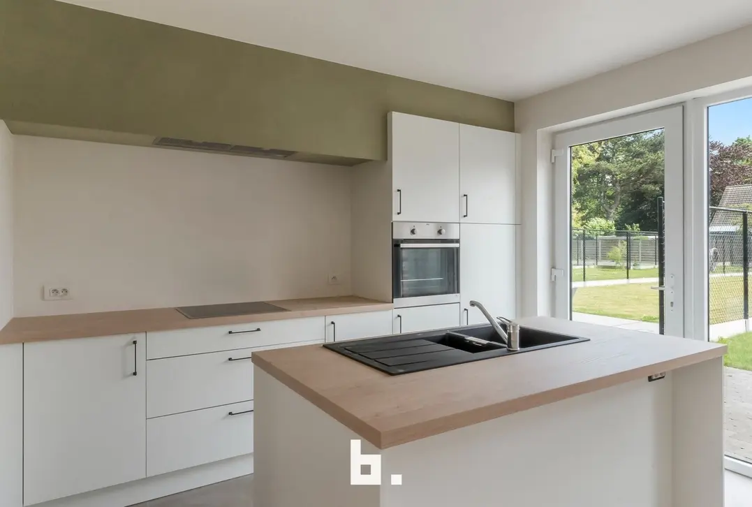 Inkomhal met gastentoilet, ruime open leef- en eetplaatsruimte die naadloos overgaat in de volledig uitgeruste open keuken met eiland die bovendien over een praktische bergplaats beschikt. Het ruime terras en de zuidgerichte tuin beschikken over een praktisch poortje achteraan.