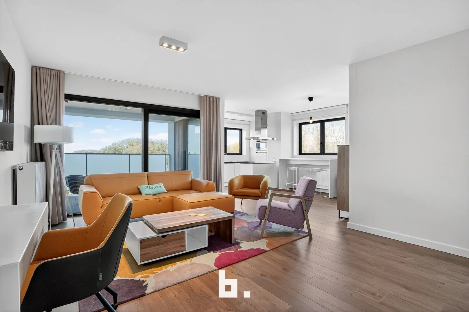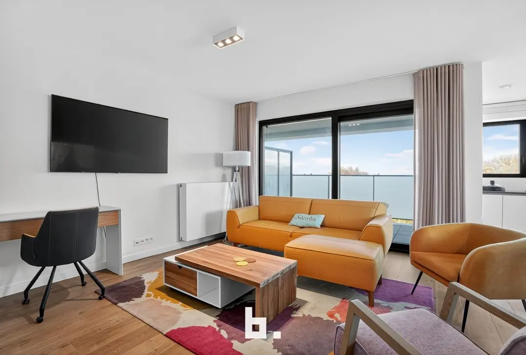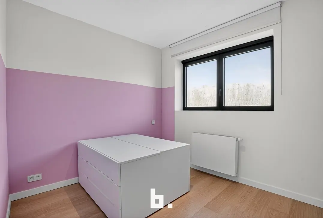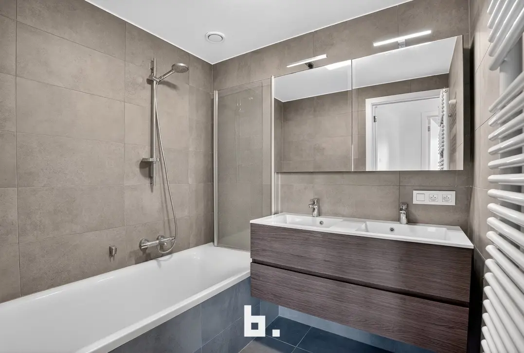 De badkamer werd stijlvol ingericht met een bad en een lavabomeubel. Verder beschikt het appartement over twee volwaardige slaapkamers, perfect als hoofd- en logeerkamer of bureauruimte. Er is ook nog een berging en afzonderlijk toilet.