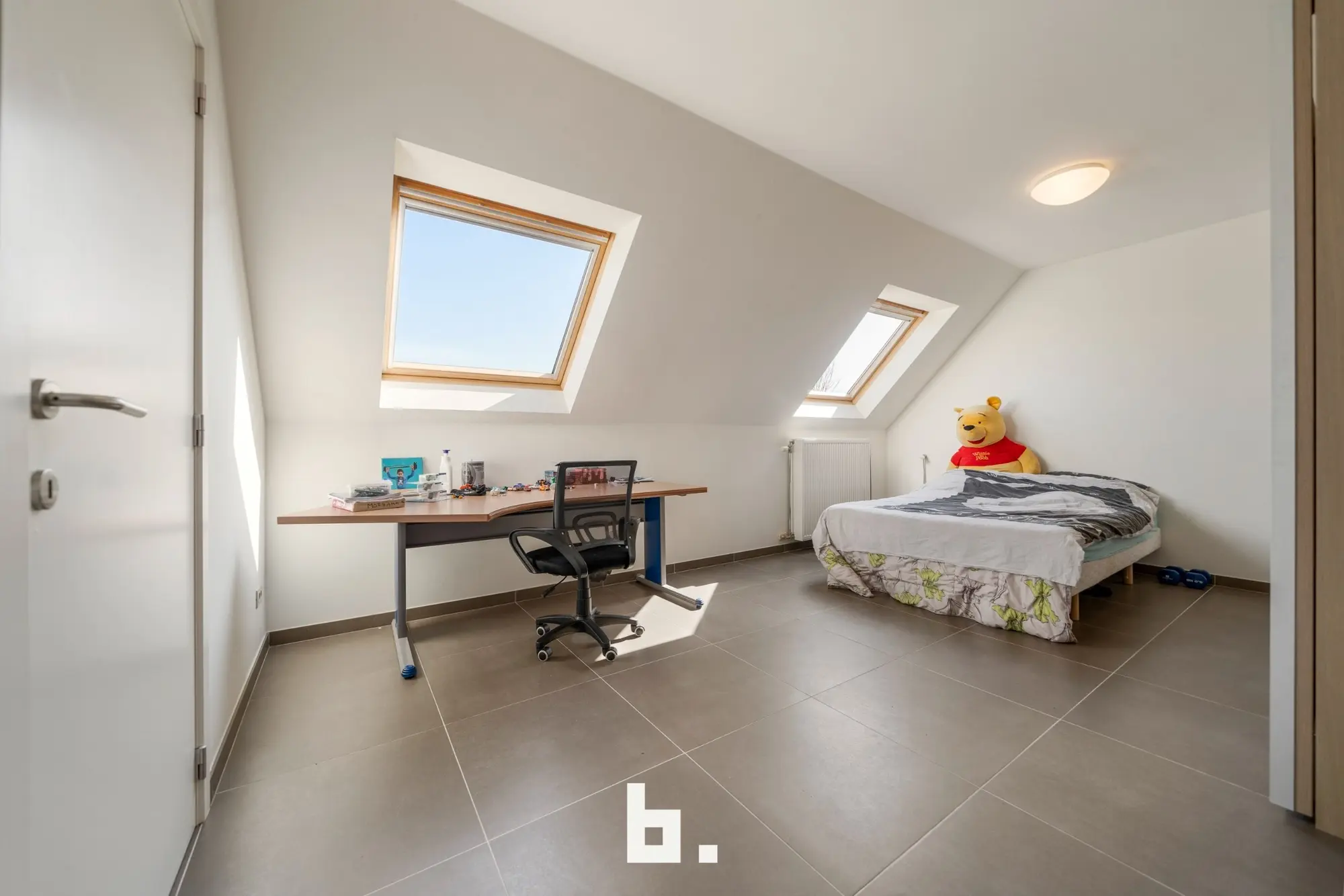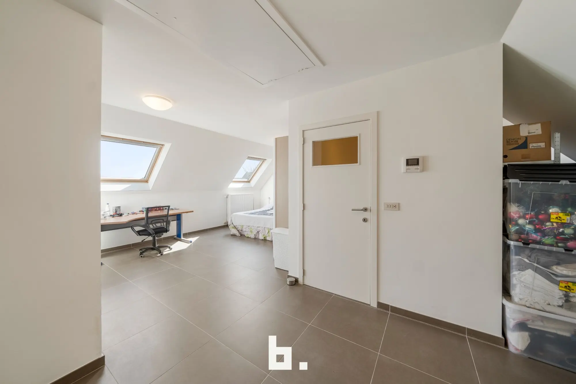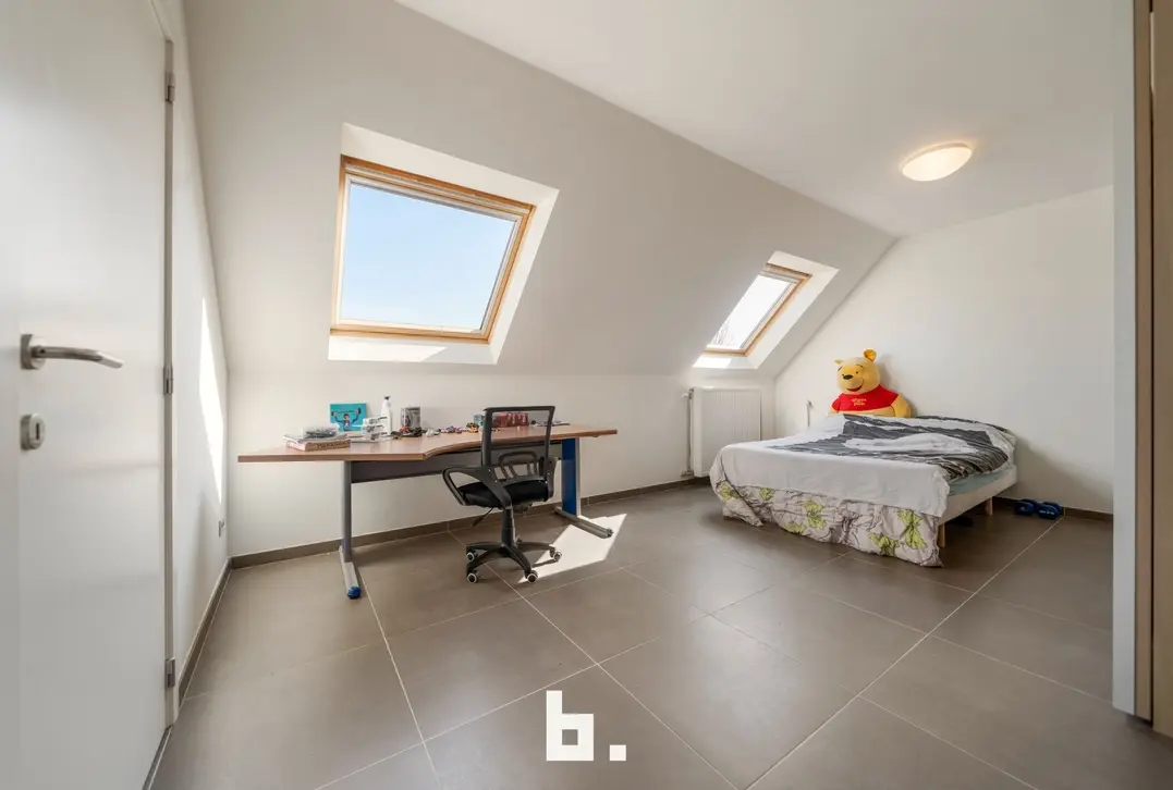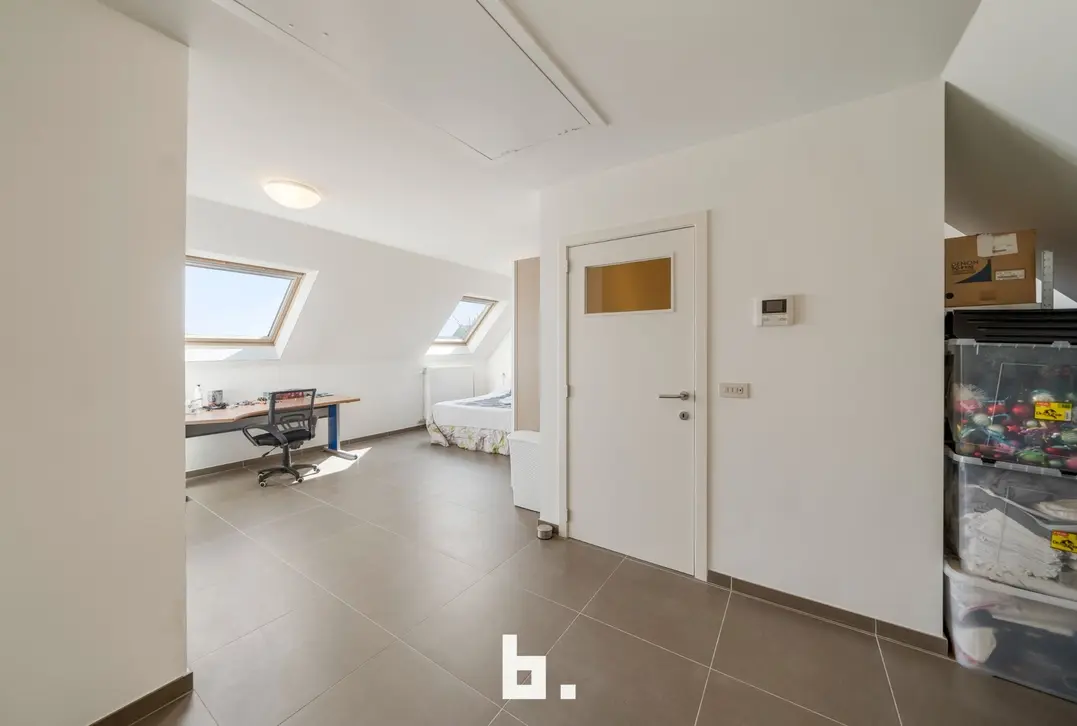 De tweede verdieping is ingericht als zeer ruime slaapkamer met sanitaire voorzieningen (toilet en lavabo). De grote zolder is bereikbaar via uitschuiftrap.