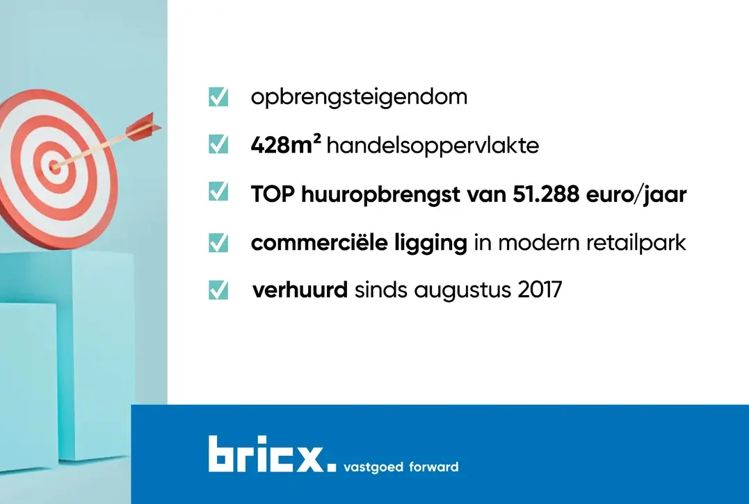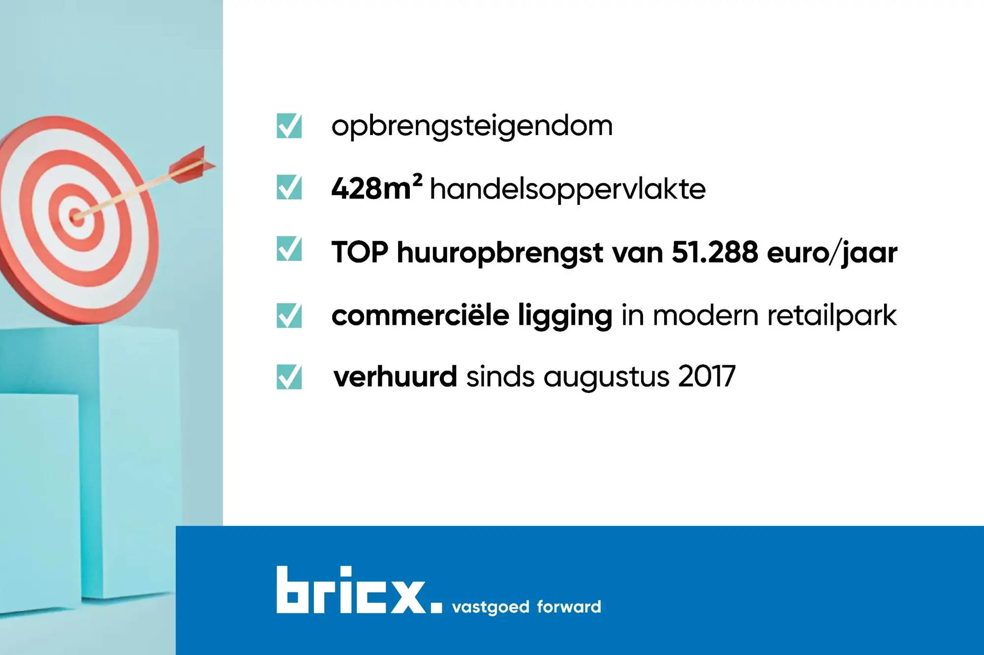 Retailpand met een oppervlakte van 428m² + 15m² berging op commerciele topligging/ Retailpark te Bocholt (Limburg), verhuurd sinds augustus 2017 aan bekende keten, waarvan de 2 de negen jarige huur verlening een 3 tal maanden geleden nog maar in voege is gegaan, syndickosten en het KI zijn ook ten laste van de huurder, het pand is verhuurd aan zeer correcte keten met tophuuropbrengst van 51.288€ / jaar. vlak voor het pand is een publieke gemeenschappelijke parking van een 200 tal wagens. TOPINVESTERING