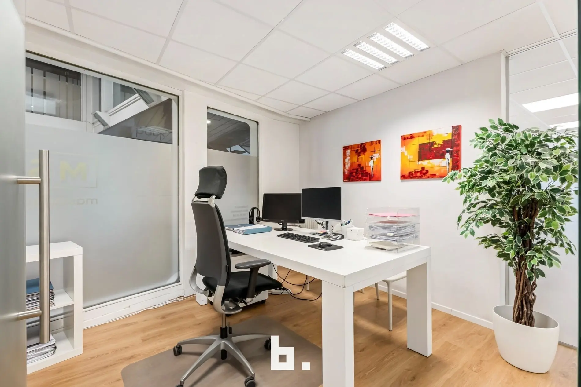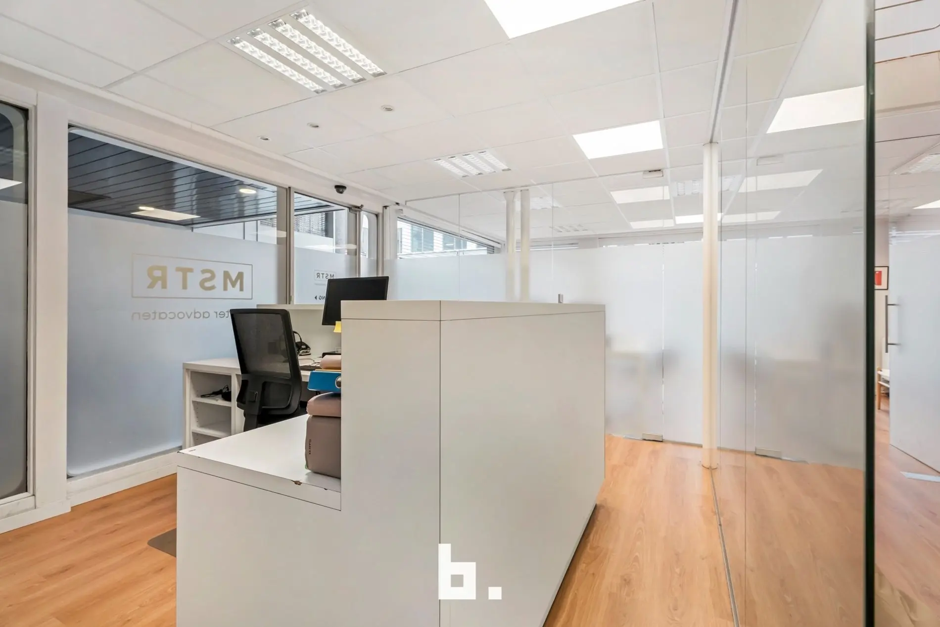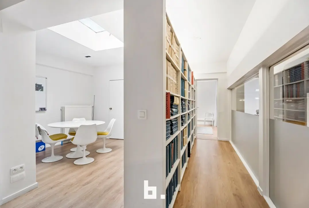 Dankzij de grote raampartijen geniet deze kantoorruimte van een moderne uitstraling en veel lichtinval, wat bijdraagt aan een productieve en aangename werksfeer.