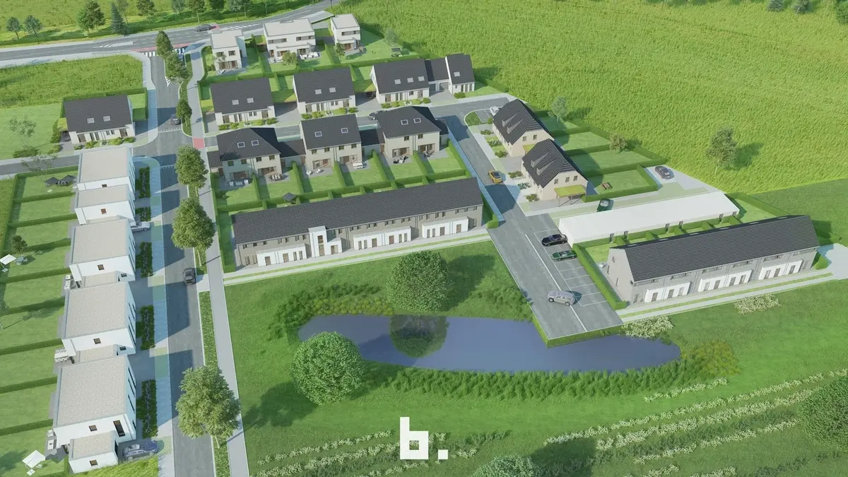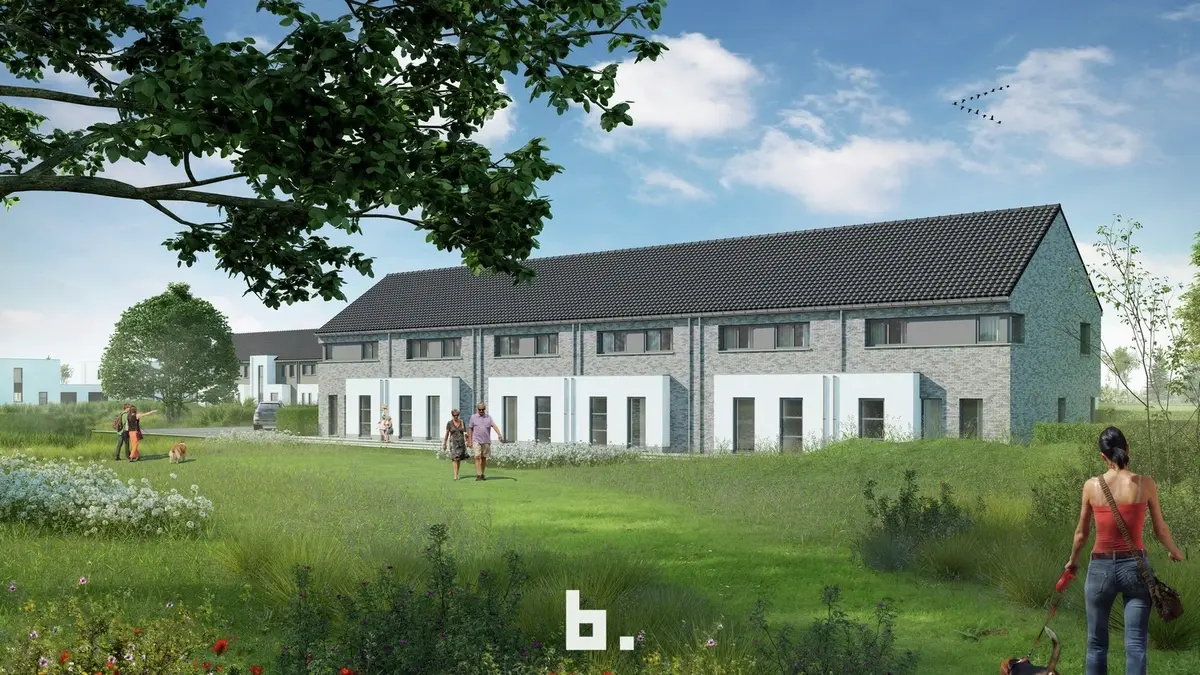Tegen de groenzone met de wadi voorzien we dertien gekoppelde compacte woningen in een tijdloze hedendaagse